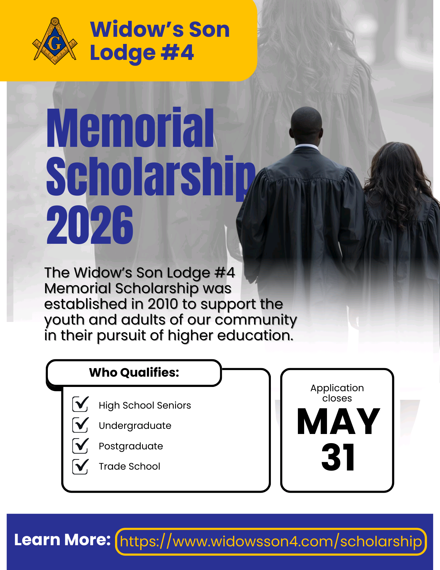 The Widow’s Son Lodge No. 4 Memorial Scholarshipwas established in 2010 to provide assistance to a deserving member in our community in their quest for higher education. The scholarship is given in honor of our dearly departed Brothers who dedicated their lives to community service, mentoring young people, and enriching the lives of everyone they encountered. We believe that today’s youth and adults should cultivate a strong sense of responsibility — both to themselves and to their communities.